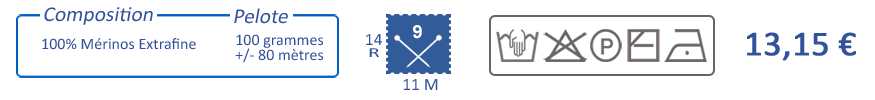 Idéalement tricoté en aiguilles n° 9, sa torsion  souple lui confère une légereté et une douceur incomparables.